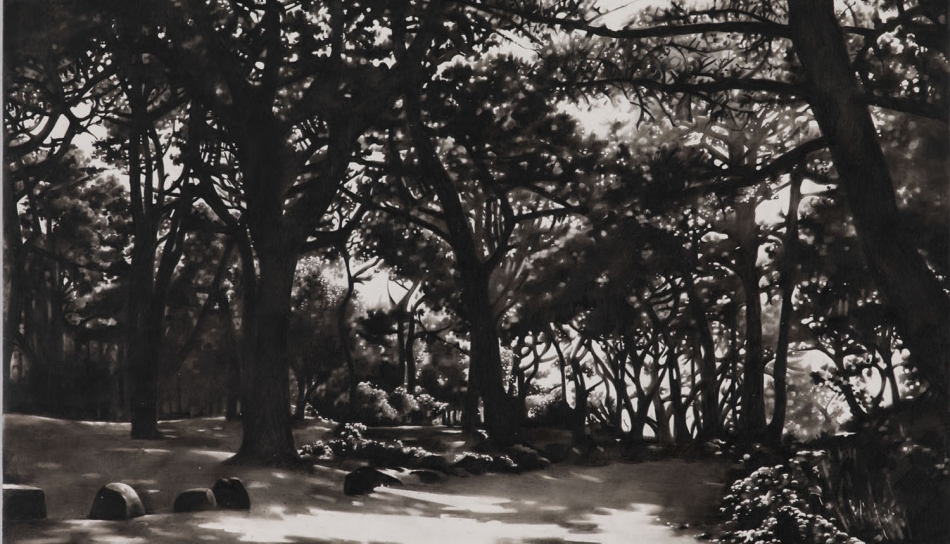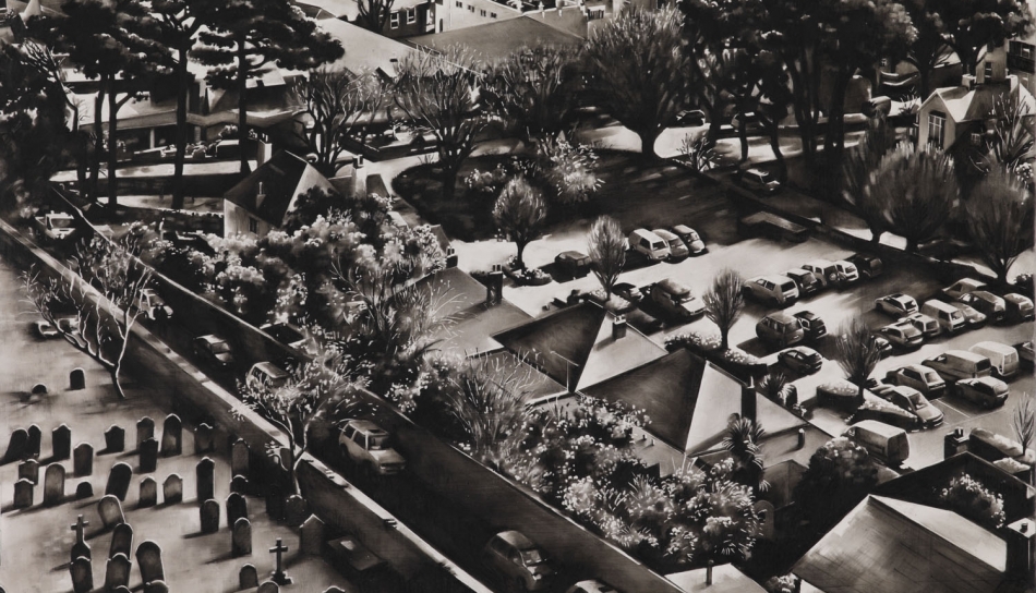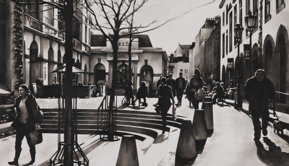 Born in Guernsey, Louise Lawton graduated from Wimbledon School of Art in 2001 and has continued to exhibit internationally. She is renowned for her stark monochrome paintings of figures and crowd formations seen from high-up perspectives. The paintings are made on boards with a beautifully prepared gesso ground and then drawn onto using compressed charcoal. Photographic in appearance, there is an abundance of white space and the detailed figures are denied any identity with their environment.